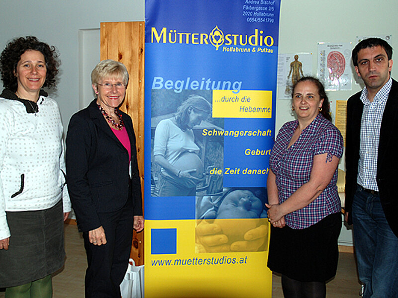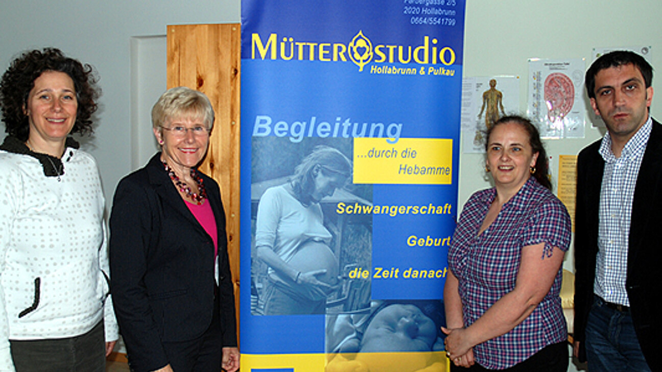 Frauen brauchen immer mehr einen Ansprechpartner in der Schwangerschaft. Ihre Gesundheitsfragen beantwortet Ihr Gynäkologe, aber die Fragen rund um Schwangerschaft und Geburt beantwortet ihre Hebamme. Der Aufgabenbereich liegt nicht im Blutdruck messen etc. sondern auch zu zeigen, dass es dem Baby gut geht z. B. wie es liegt, wie es sich drehen kann, wie sich Mutter und Kind wohl fühlen können, wie sich die werdende Familie am Besten auf die Geburt vorbereiten kann. Beim Tag der offenen Tür im Mütterstudio Hollabrunn am Mittwoch, den 5. Mai konnte man sich persönlich von den umfangreichen Leistungen überzeugen. Auch Landtagsabgeordnete Marianne Lembacher und Bürgermeister Erwin Bernreiter statteten der Dipl. Hebamme Andrea Bischof einen Besuch ab.