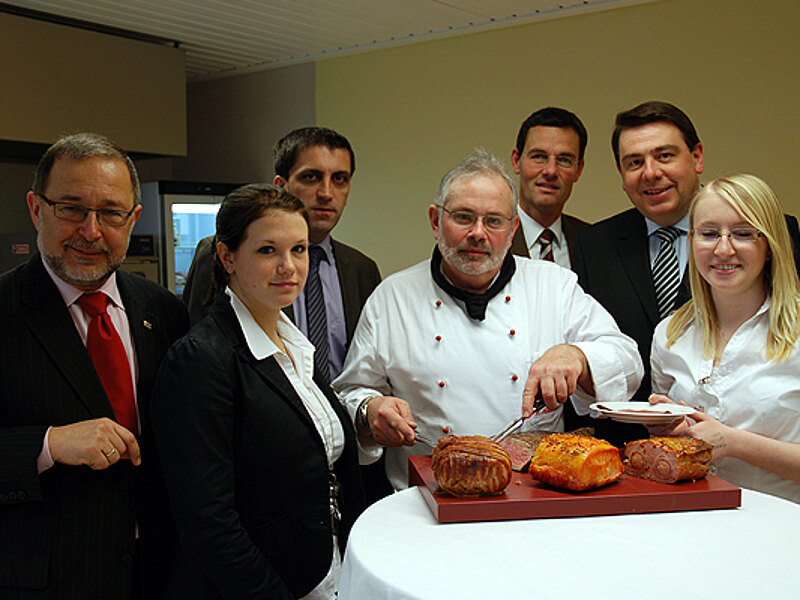 Direktor DI Manfred Winkler begrüßte die Ehrengäste vor dem Eingang des neuen Trakts, bevor Bürgermeister Erwin Bernreiter und NR Mag. Heribert Donnerbauer das rote Band feierlich durchtrennten. Der neue Raum konnte schon gustatorisch wahrgenommen werden, hatte doch Starkoch Hubert Mestenhauser im Auftrag der Fa. Gramiller seit den frühen Morgenstunden das Fest vorbereitet ...