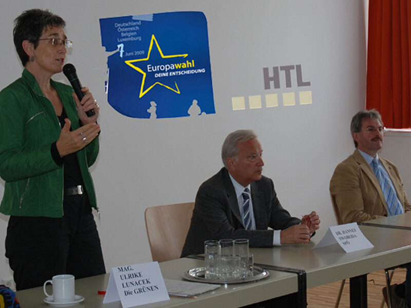 VPNÖ Europasprecher LAbg. Mag. Karl Wilfing diskutierte mit Spitzenkandidaten der SPÖ Dr. Hannes Swoboda und der Grünen Mag. Ulrike Lunacek und Schülerinnen und Schüler der HTL Hollabrunn.